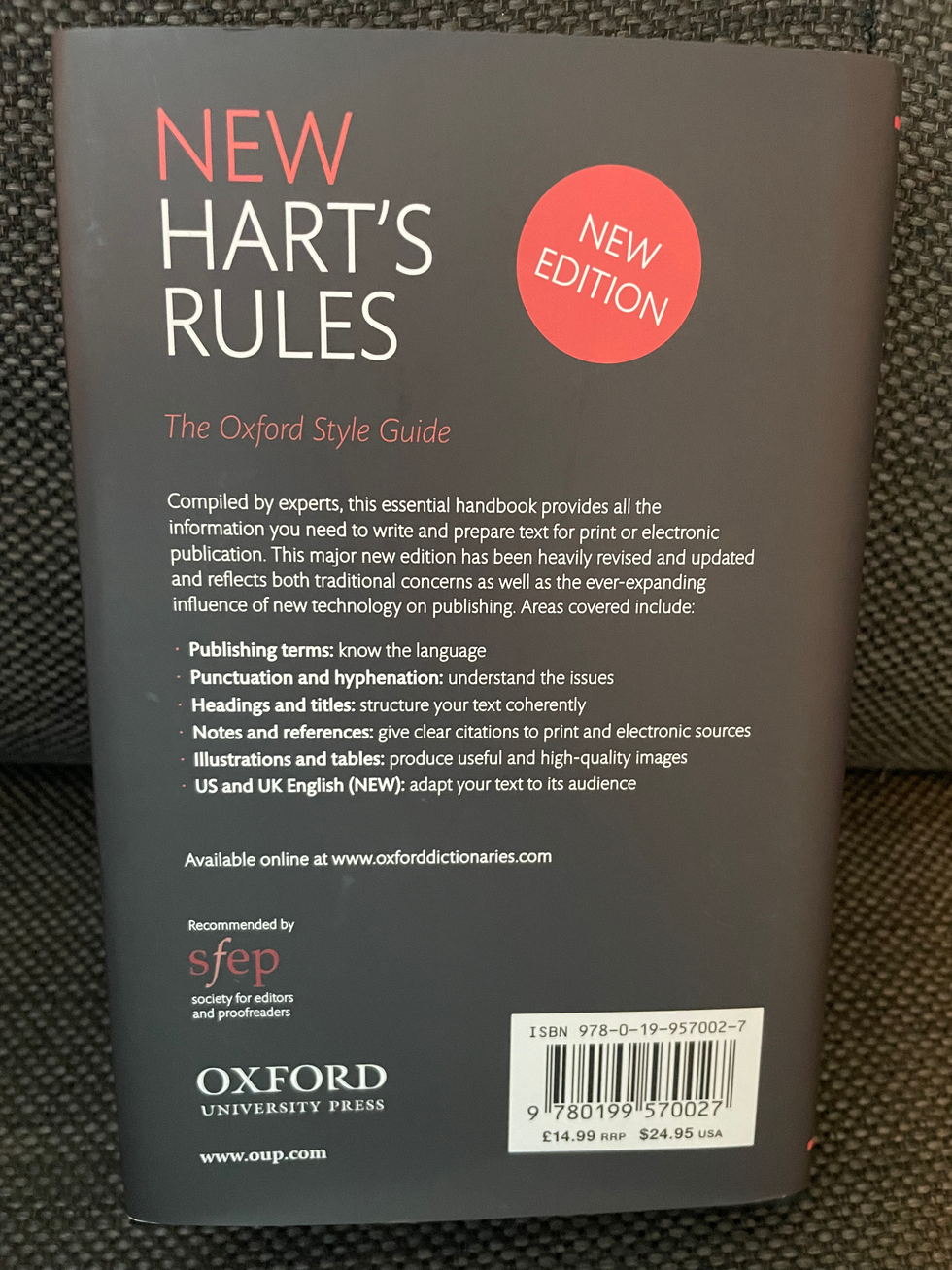 The New Hart's Rules book is only small, but don't let that fool you. It is part of the Oxford Style Guide (there are more books in the series) and, therefore, a preferred guide when you are writing for the British population or countries that prefer British English. This almost pocket-sized book features 400+ pages and covers basically everything. It is my go-to book for those queries that need a mental nudge. Us editorial folk also get confused from time to time!